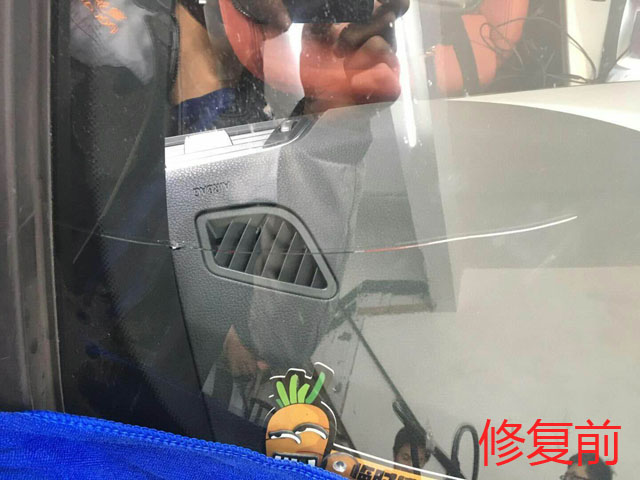 據(jù)車主介紹,愛車在高速路上被石子中,一開始只是一個小點,因為在副駕駛位置,不影響視線,所以就沒在意,誰承想沒幾天的功夫裂紋竟然向左右兩端延伸,而且左側(cè)裂紋已經(jīng)延伸到擋風(fēng)玻璃邊緣,右側(cè)還再延伸,這時候才意識到,擋風(fēng)玻璃裂紋不能再拖了!所以經(jīng)朋友介紹才來皇菠蘿的!