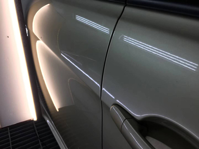車門是車身發(fā)生凹陷幾率比較大的部位,因為車門面積在車身總面積中占有很大比例。而修復(fù)車門凹坑杠桿工具可以從玻璃升降孔位置進(jìn)入,將凹陷細(xì)化,然后再逐步修復(fù),雖然凹坑很小,但是也是需要細(xì)分后再修復(fù),才能保證修復(fù)效果。整個修復(fù)過程都在整平燈的照射下進(jìn)行,因為這樣能夠很好的判斷凹陷的恢復(fù)情況及細(xì)節(jié),保證凹陷完全修復(fù)到出廠狀態(tài)。
